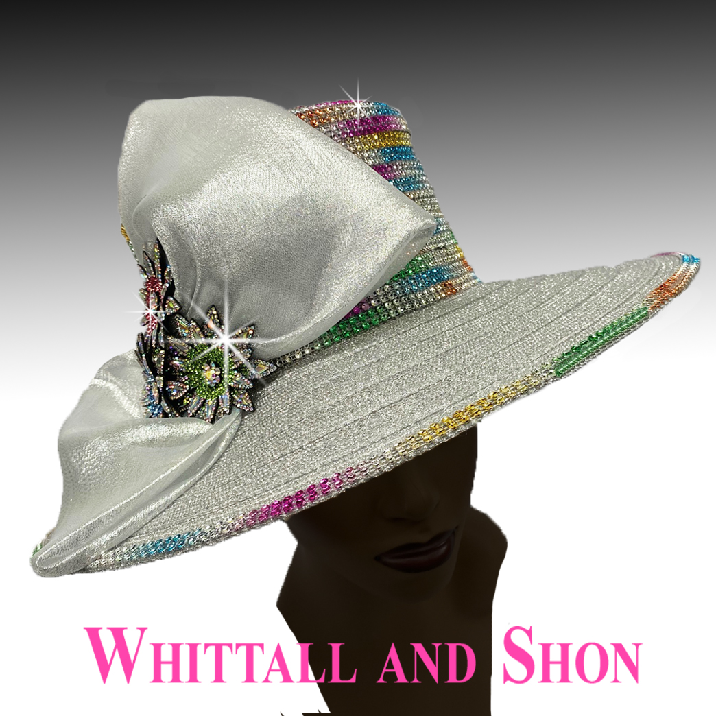 Multi hued faux crystals adorn the edge and crown of this classically proportioned hat with its 4″ brim and 4.5″ high crown. A menagerie of crystals and paillette flowers adorn 2 quills. The adjustable sweatband allows for varying head sizes.