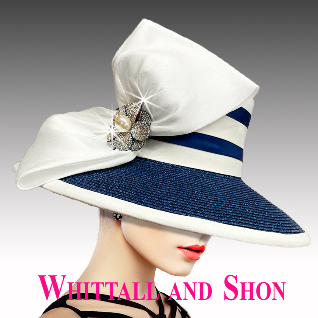 Like its namesake, this stylish hat is simple, clear and commanding. The 4.5″ crown and 5″ brim, adorned with military stripes, are a tribute to a great American hero. The military tone, however, is softened with a profile bow and a crystal encrusted camellia. An adjustable sweatband allows for differing head sizes. A must for the Derby!
