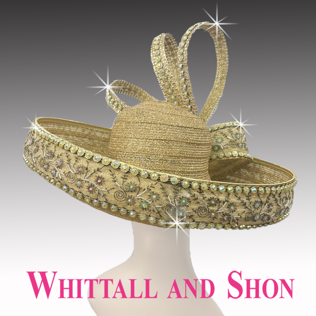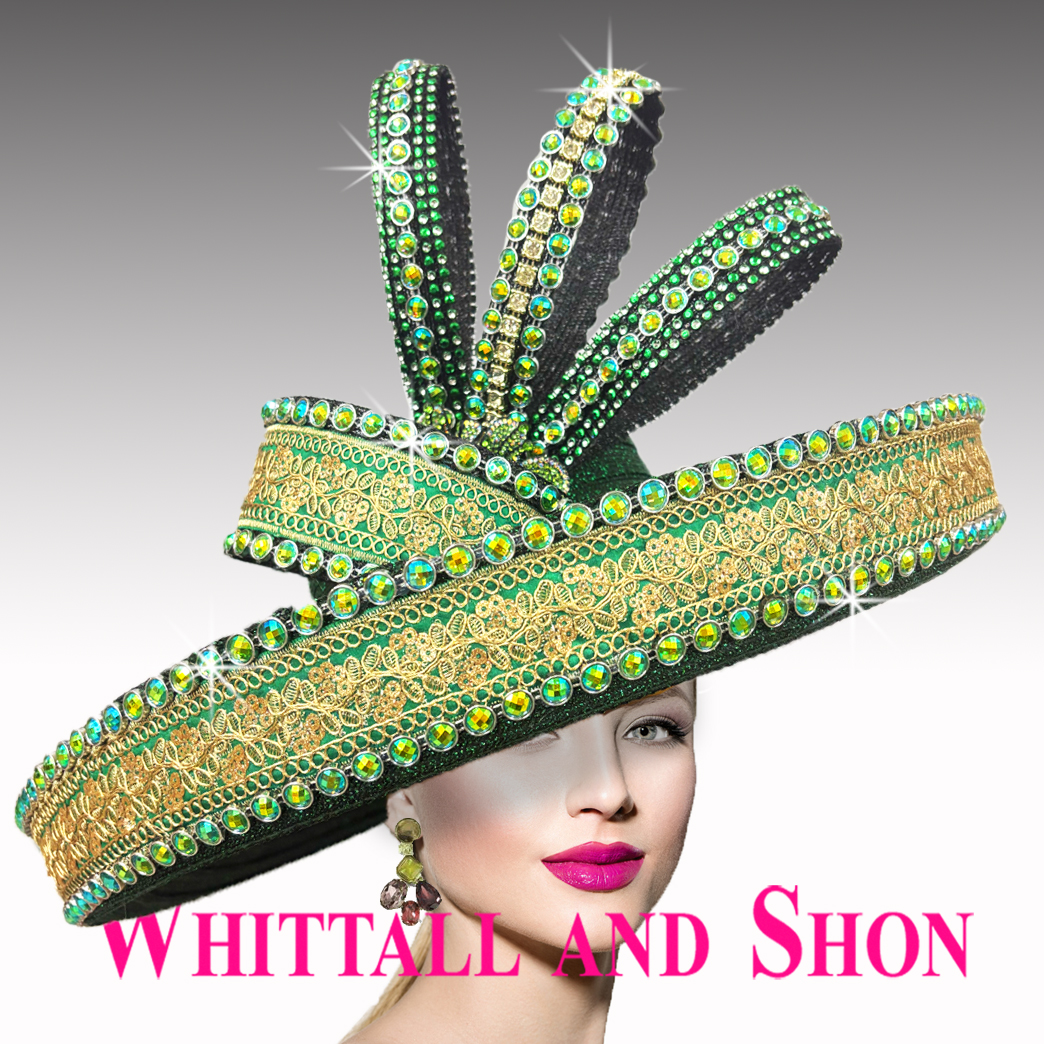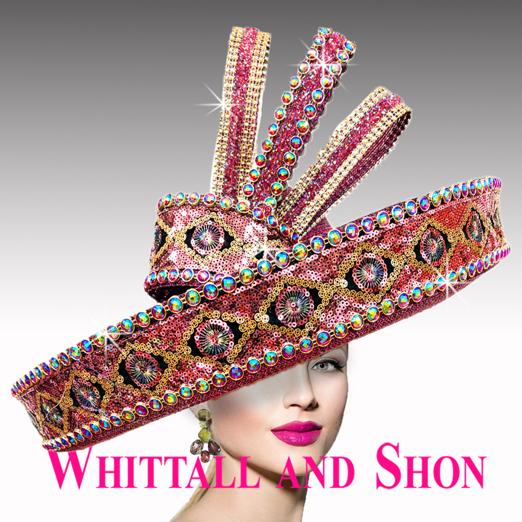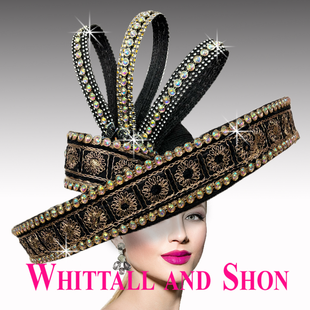 CELESTIAL is an opulent statement hat that evokes the majesty of the cosmos. Designed with theatrical elegance, its dramatic 5-inch brim is further extended by a 2.5-inch upturned lip. The round crown assures a comfortable fit. The brim’s edge is entirely blanketed in embroidery and framed with glittering stones. Artfully angled for dynamic visual balance is a matching loop that cradles a tripod of jeweled tentacles.