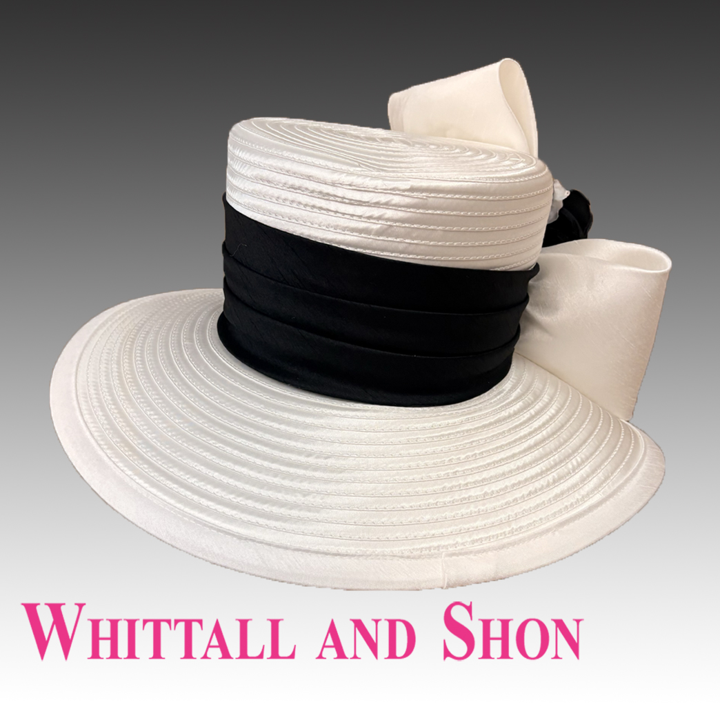 Robin is a true embodiment of understated elegance and timeless style. Its tailored silhouette is achieved through the flat crown ( 5″ high) and crisp geometric brim (4.5″). At the heart of the hat, a dramatic bow holds a luxurious bloom, adding a touch of opulence and soft femininity. This hat is perfect for a wedding, the Derby, or any special occasion. The sweatband is adjustable.