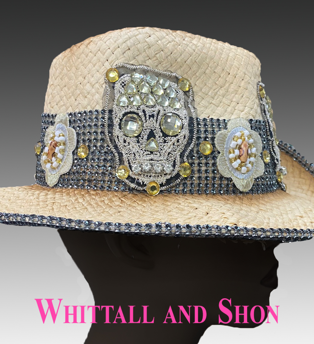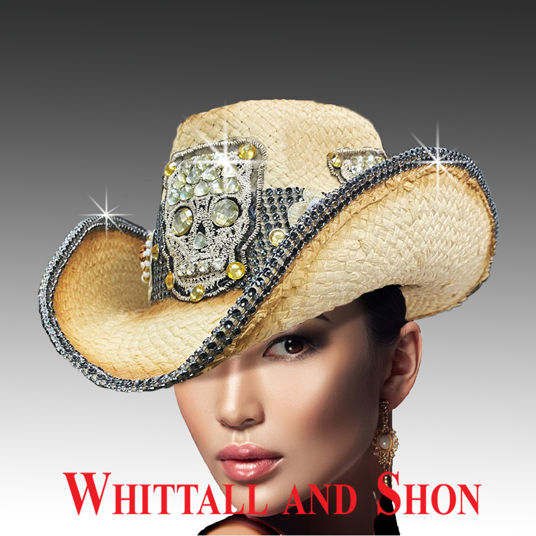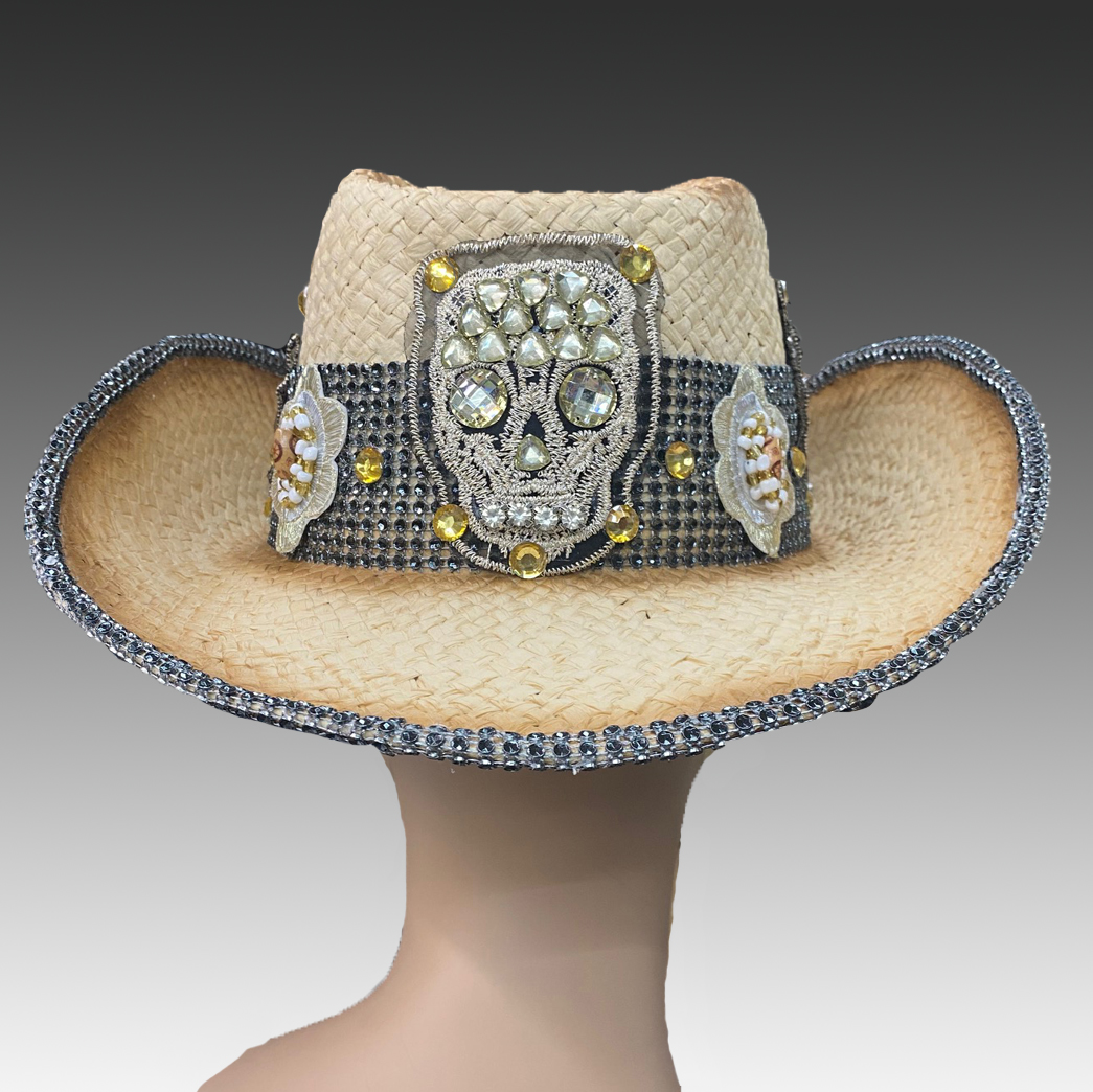 Back by popular demand, the diamond skull is reborn on this natural toned straw cowboy. Glittering eyes, embroidered concho motifs, and faux onyx crystal bands finish this popular look. The wired brim allows you to style the hat to your liking. The adjustable sweatband allows for different head sizes.