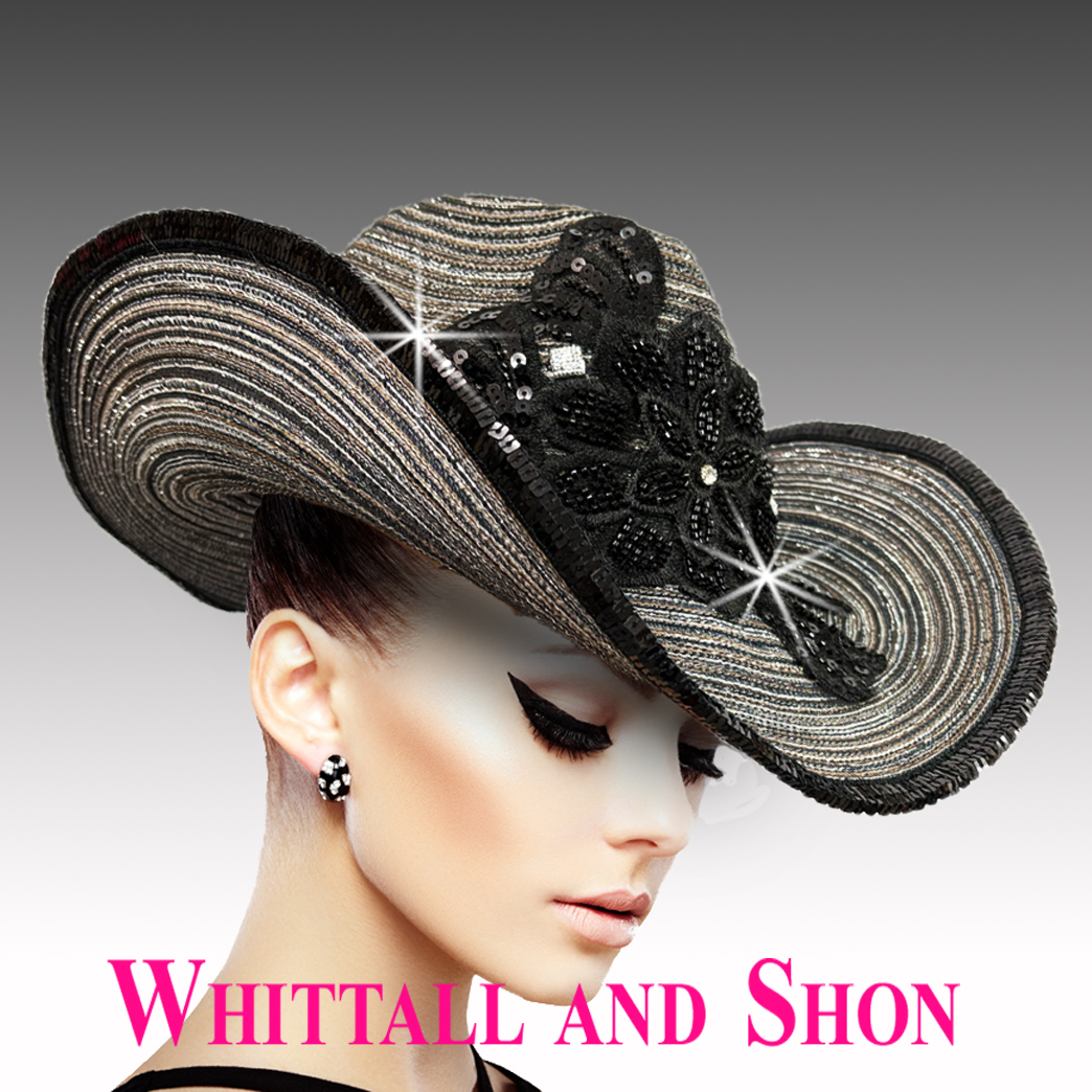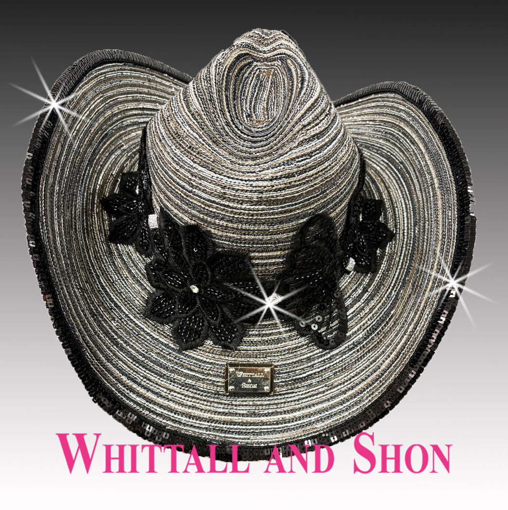 Smoke toned spaced dyed cotton and straw braid western hat with lace appliques. Lace is artfully embellished with jet and hematite tone beads, smoke crystals and sequins. A sequin wrapped wired edge keeps the integrity of the western brim and allows the wearer to shape the brim. An adjustable sweatband allows for different head sizes.
