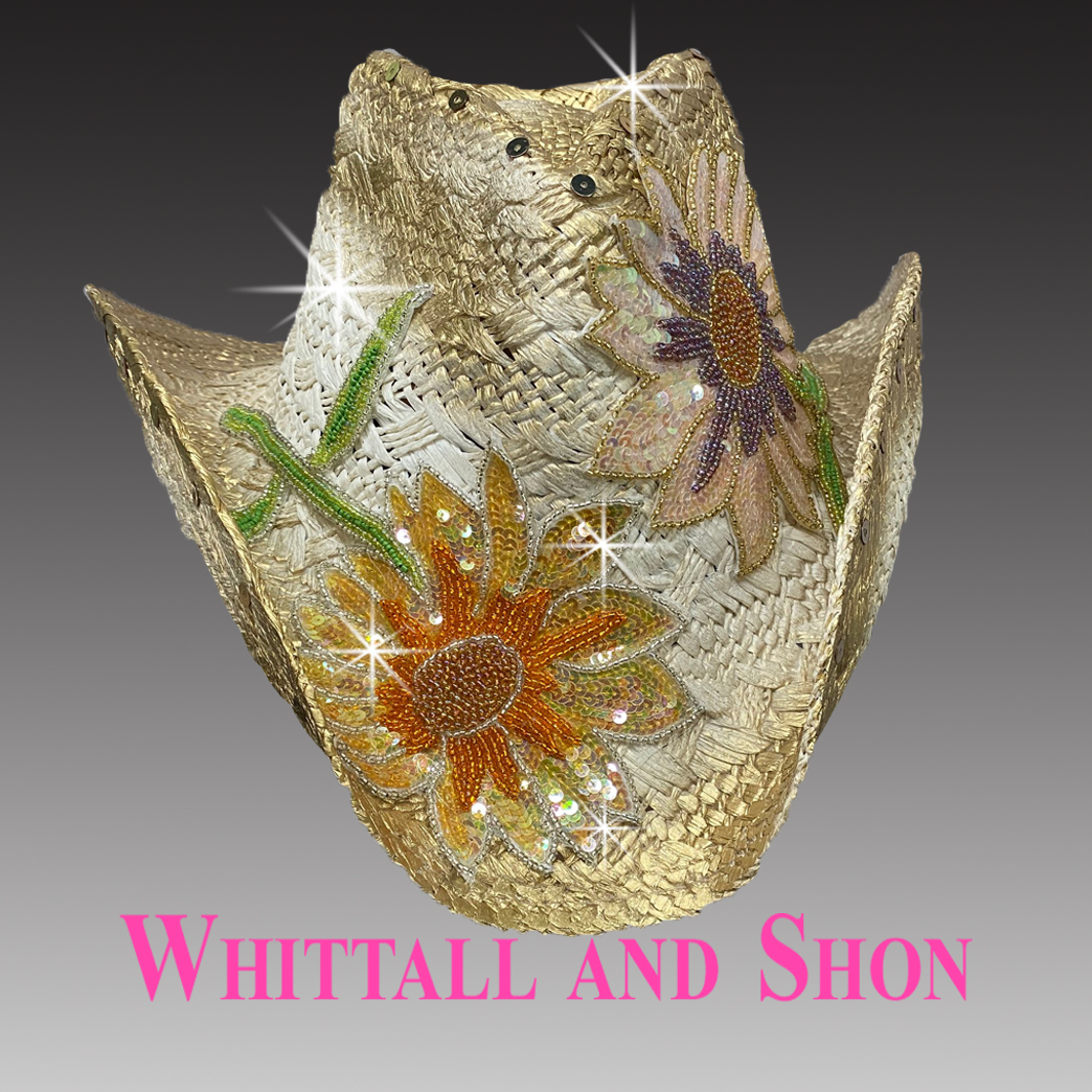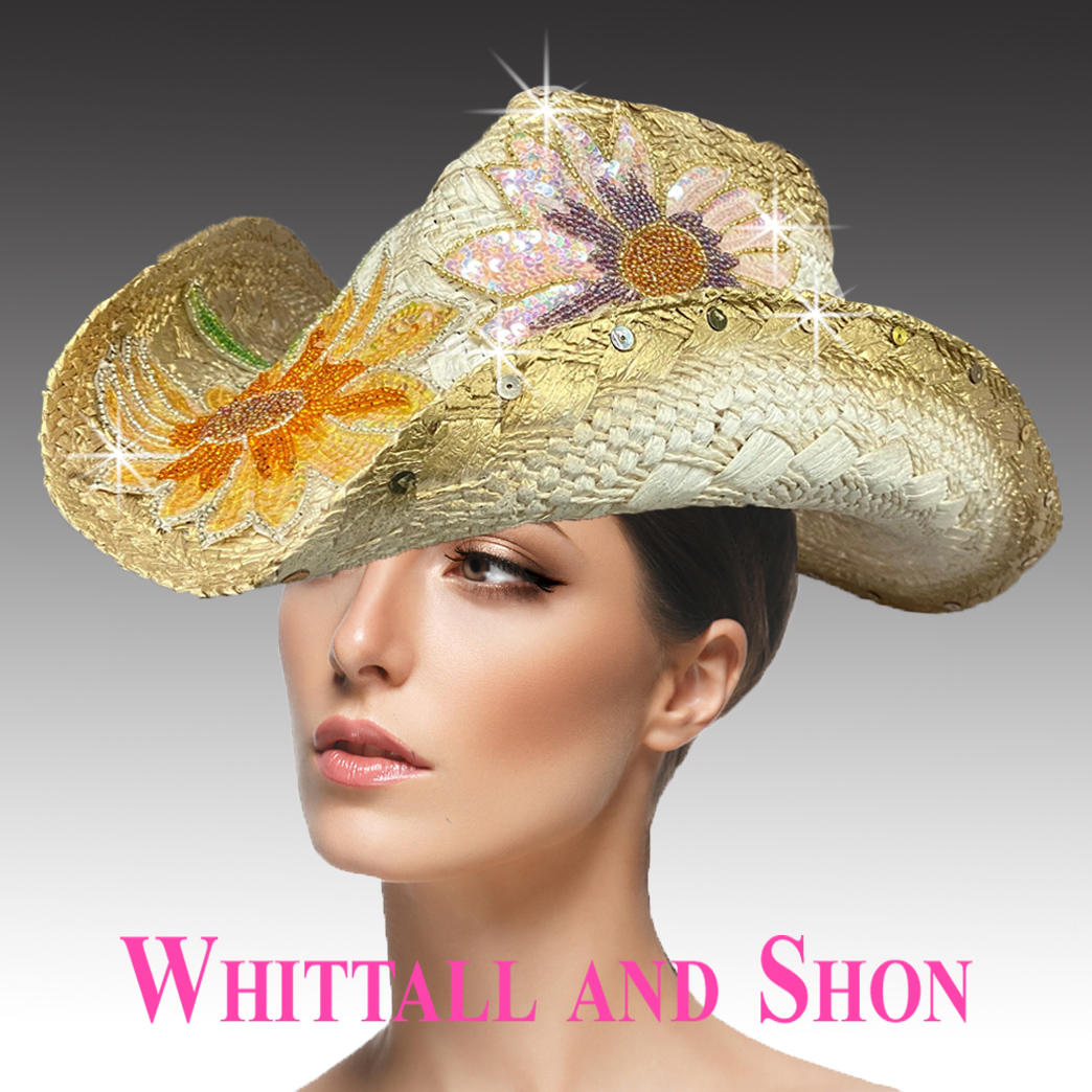 An ivory straw cowboy hat gleams with a subtle gold shadows and a sprinkling of tonal sequins that catch light with every movement. Adorning the crown of the hat are whimsical sunflower motifs, each one crafted with intricate detail. The sunflowers dance across the hat as if swaying gently in an imaginary breeze.