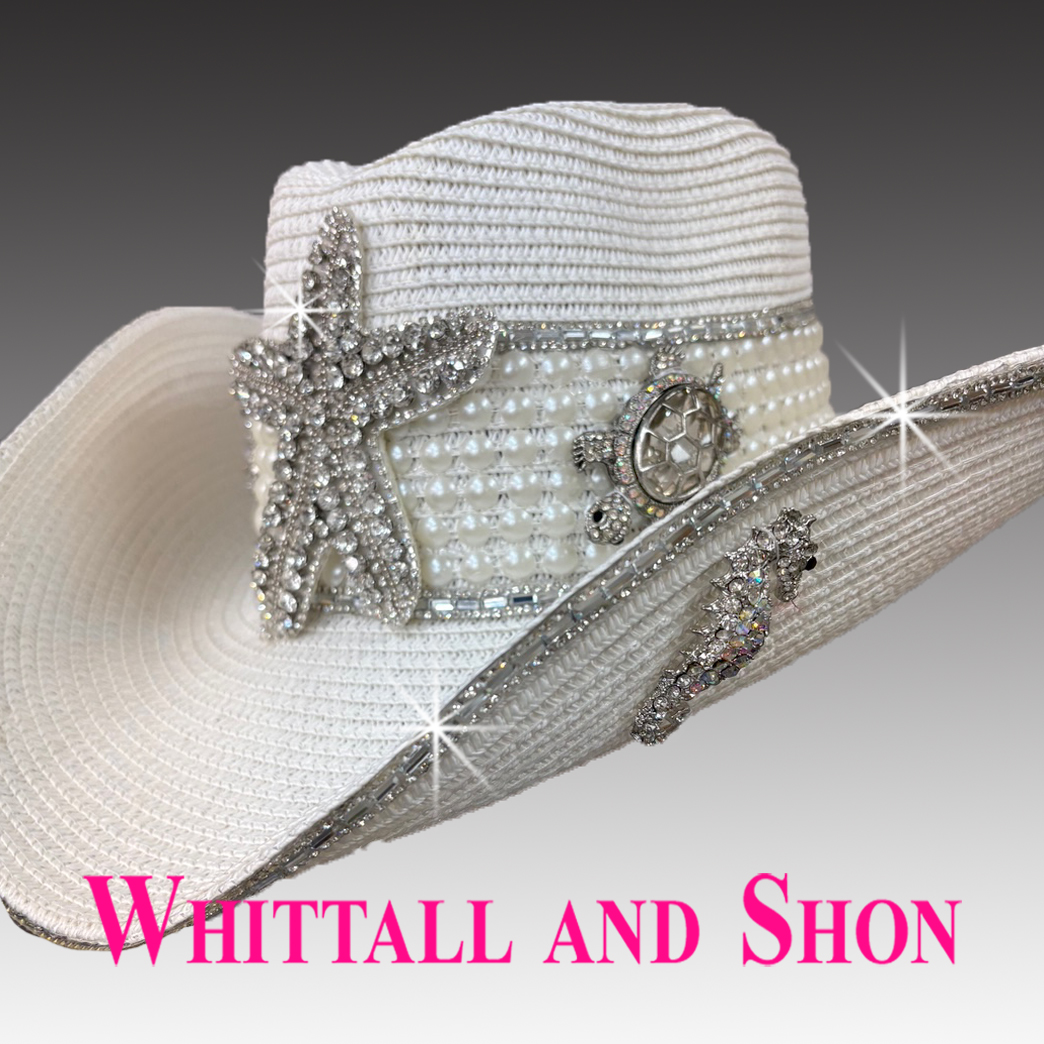 The ‘NEPTUNE’ cowboy hat is a whimsical celebration of marine life. The pearl and crystal hatband features a stunning jewel-laden starfish. Playful crystal dolphins and tortoises dance along the band to complete the aquatic scene. The adjustable sweatband ensures a perfect fit, making this hat as comfortable as it is enchanting. Ideal for those who want to carry the magic of the ocean wherever they go.