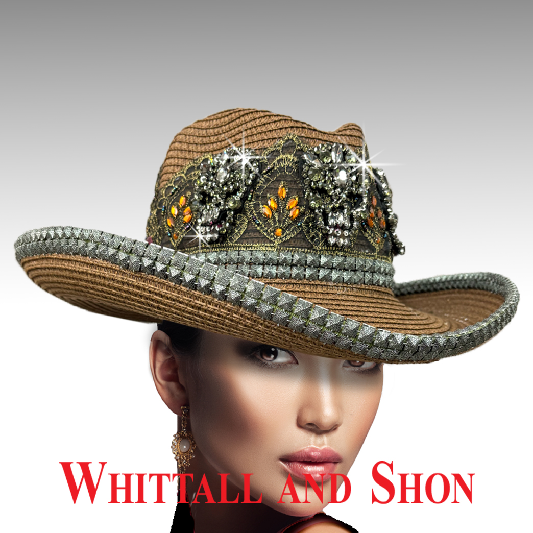 This festive cowboy walks the line between edgy glam and rich cultural homage. Front and center sits a trio of sparkling crystal skulls, gleaming like desert stars under stage lights. The hatband is a folkloric-themed lace, rich with intricate embroidery of golden threads and multi hued stones and contrasts with the hammered faux metal nailheads that frame the brim. The adjustable sweatband allows for different head sizes.